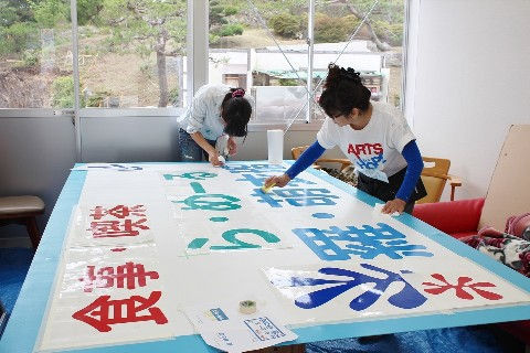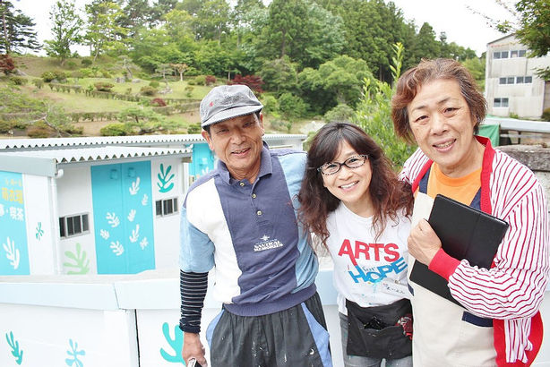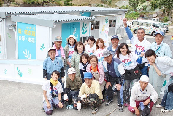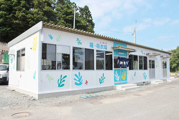 碁石海岸にある復興食堂から依頼をいただき、プレハブ店舗を明るく塗り変えました。 店主の大和田ご夫妻は20年以上営んできた民宿と自宅を震災で失い、仮設住宅で生活を続けながらも自宅跡地での再建に奮闘してきました。「被災のイメージを払拭するような明るい外観にしてほしい」という思いに応え、近隣の住民さんとともに3日間をかけてリノベーションを行いました。